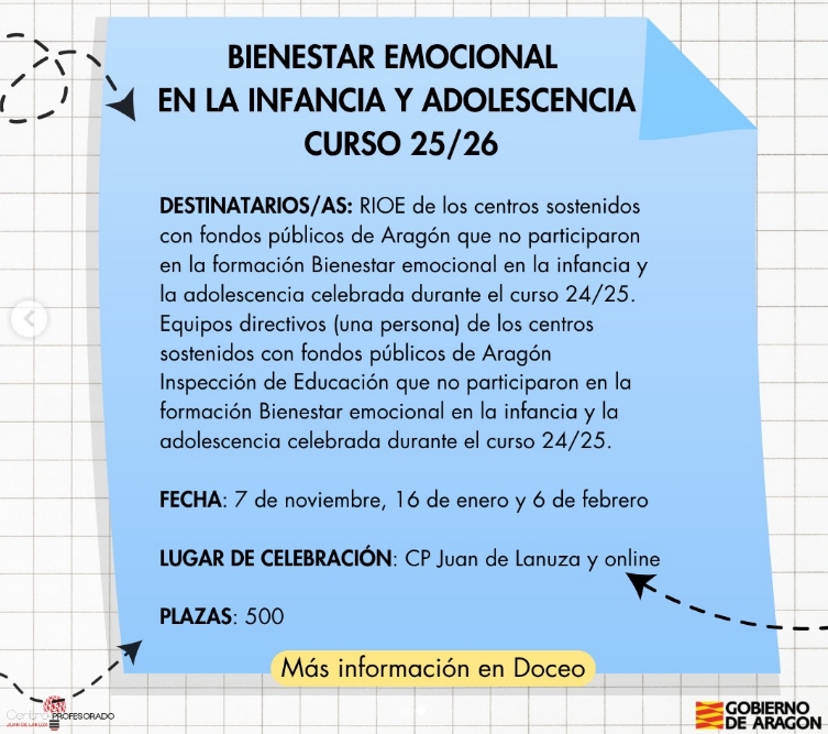 La formación autonómica Bienestar emocional en la infancia y adolescencia, organizada por el Centro de Profesorado Juan de Lanuza de Zaragoza, tiene como finalidad fortalecer las competencias del profesorado y los equipos de orientación en el acompañamiento emocional del alumnado. Este curso mixto combina sesiones presenciales y online y ofrece una actualización práctica sobre el impacto del trauma, la regulación emocional y las bases neuroeducativas del bienestar.